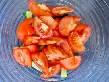 Помидоры вымойте, обсушите и нарежьте дольками. По желанию, чтобы салат был менее водянистым, можете удалить сердцевину с семенами. Если у вас помидоры черри - нарежьте их половинками. Помидоры нужны сочные, но плотные. Мягкие плоды плохо держат форму, в процессе нарезки и приготовления они расползутся в бесформенную массу и испортят внешний вид блюда.