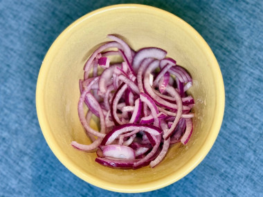 Луковицу очистите и нарежьте тонкими полукольцами. Лук слегка помните руками, чтобы он пустил сок. Репчатый лук можете заменить на красную луковицу или шалот.