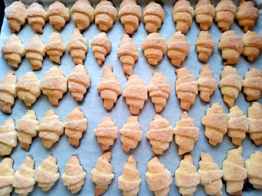 Тесто я разделила на две части и убрала в холодильник охлаждаться. Мне было удобнее раскатывать по 1/2 части каждого комочка. Итого получилось 4 круга, каждый поделила на 16 секторов. Выпекала рогалики при 180°С пол часа. Получилось их много, правда, исчезли они очень быстро). Творожное тесто потрясающе вкусное, слоистое, нежное! Сверху хрустящая сахарная корочка! Спасибо за удачный рецепт вкусной, ароматной выпечки!