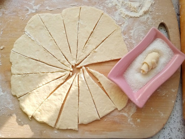 Верх заготовок обваляйте в сахаре. Нижняя часть должна остаться чистой, иначе сахар под рогаликами будет плавиться и гореть.
