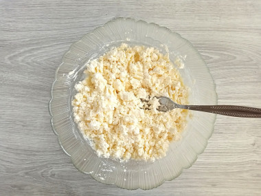 Сливочное масло я нарезала маленькими кусочками и довела до мягкого состояния в микроволновке на программе "разморозка фруктов". Главное следить, чтобы масло не начало таять. Затем размяла масло с творогом, добавила сахар, соль и ванилин и снова размяла. Сахара я взяла меньше на 20 г. Частями добавляла просеянную муку и разрыхлитель. Муки у меня ушло столько же и еще немного для раскатки теста.