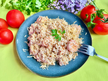 Готовила на две порции. Перед приготовлением отварила креветки, так как они были сырые. Далее готовила по рецепту.