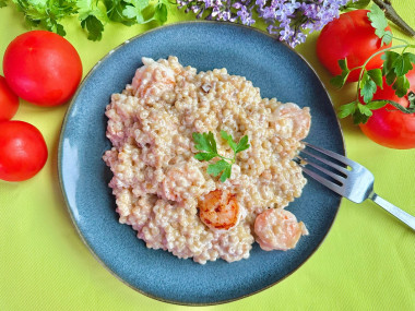 Птитим с креветками в сливках украсьте тертым сыром и сразу подавайте к столу. Приятного аппетита!