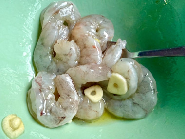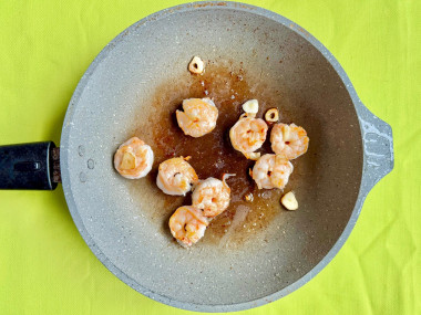 Ингредиентов использовала на две порции. Креветки решила предварительно замариновать на 30 минут в чесноке с оливковым маслом. Креветки обжарила на сковороде, так как у меня они были сырые. Далее готовила все по рецепту.
