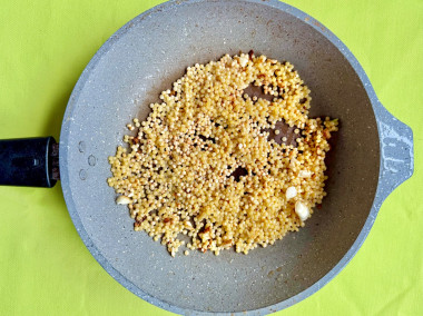 Добавьте в сковороду птитим, перемешайте и обжаривайте на среднем огне еще 2-3 минуты, помешивая.