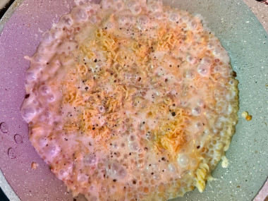 Как только сливки начнут кипеть - добавьте креветки и тёртый сыр (немного сыра можно оставить, чтобы посыпать им готовое блюдо). Готовьте еще примерно 5 минут (сыр должен расплавится).
