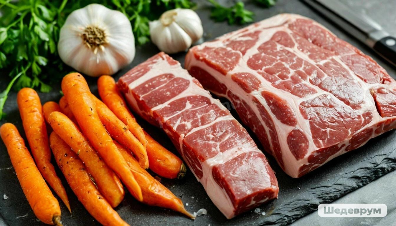 Подготовка мяса: Вымойте свинину, обсушите бумажным полотенцем и сделайте неглубокие надрезы острым ножом. Очистите морковь и чеснок.