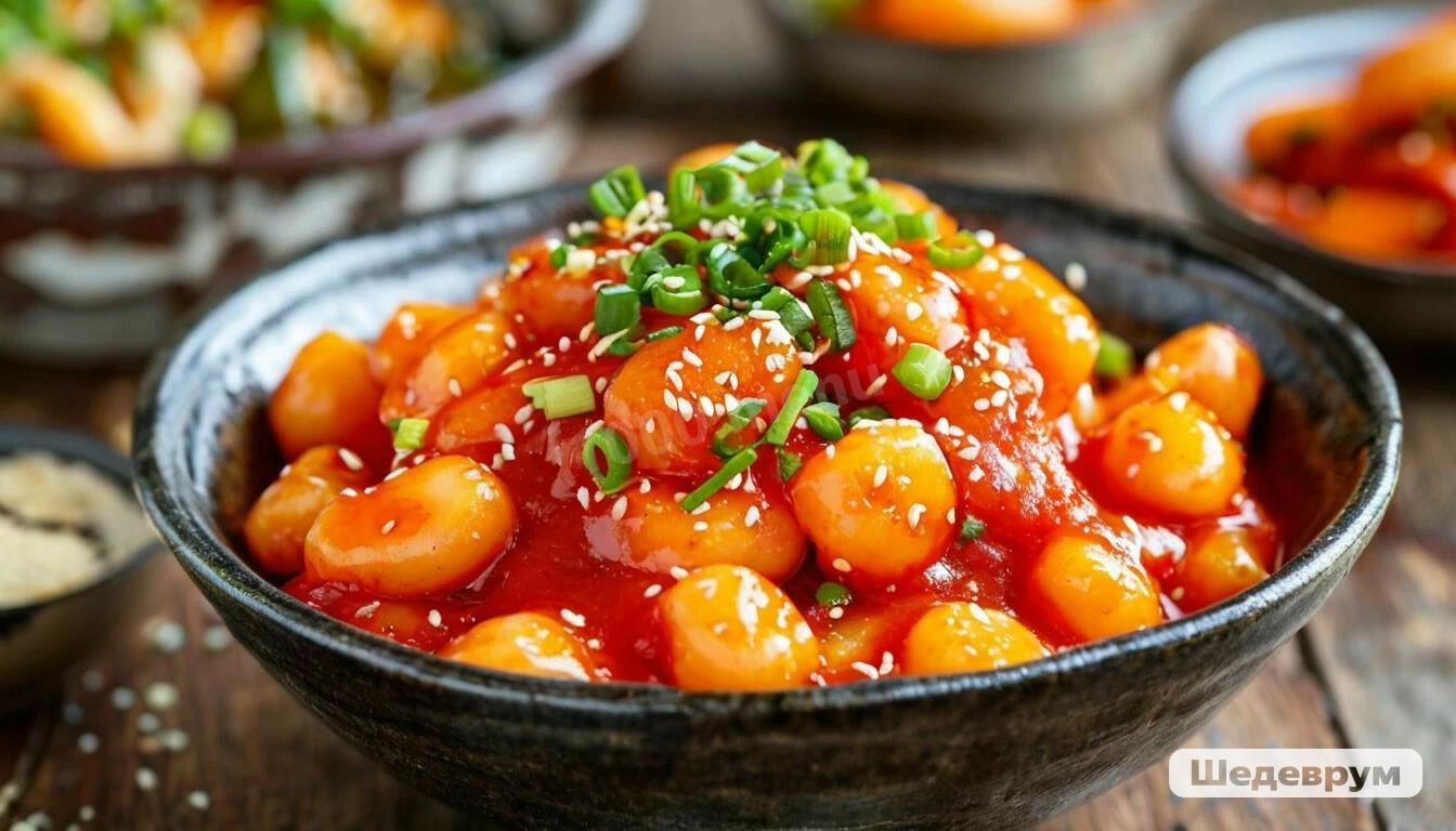 Вылейте 350 мл воды в сковороду. Выложите ттокпокки. Доведите до кипения на сильном огне.