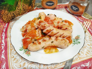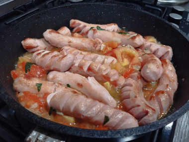 Получилось очень вкусное блюдо! Сосиски пропитались овощным соком, ароматом.