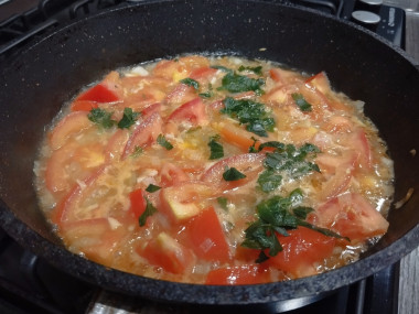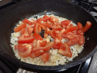 У болгарского перца отрежьте плодоножку, удалите семена и нарежьте полукольцами, помидоры нарежьте кусками. Положите овощи в сковороду с луком. Овощи посолите, поперчите и тушите на среднем огне около 10 минут. Если мало жидкости, влейте немного воды.