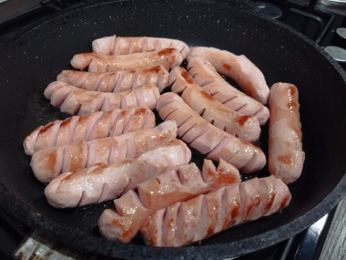 Сосиски очистите от пленочной оболочки и, при желании, сделайте небольшие насечки с 3-4 сторон. Это сделает сосиски более интересными на вид и соус легче проникнет внутрь. В сковороду налейте растительное масло и разогрейте на среднем огне. Масло берите без запаха, а какое подобрать для приготовления можно узнать под шагами ниже. Положите сосиски и обжарьте со всех сторон до румяной корочки. На это уйдет примерно 4-5 минут, переложите их в тарелку.