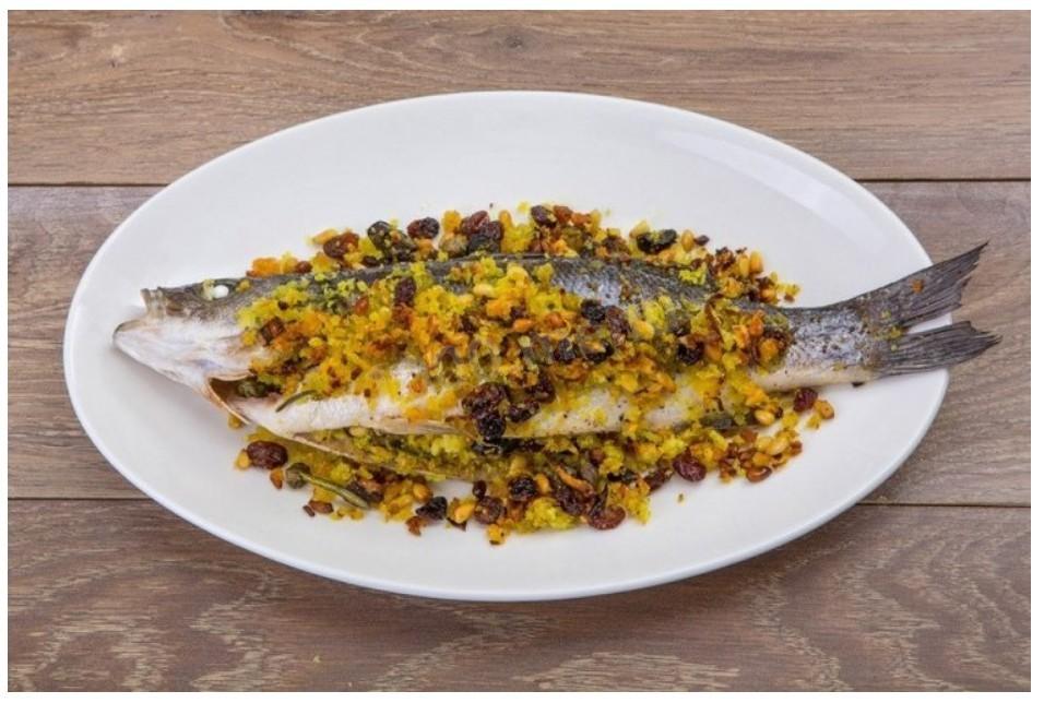 Сибас с орехами и изюмом в духовке