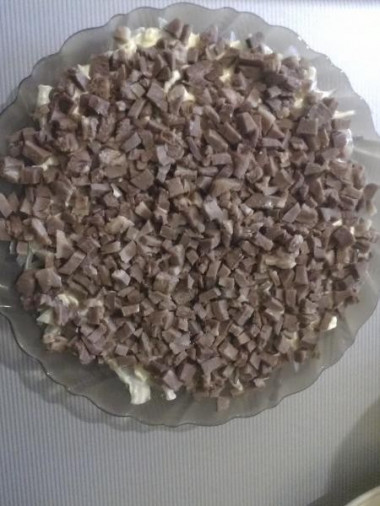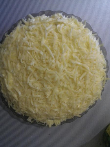 Последним слоем выложите сыр, натертый на мелкой терке. С готового салата снимите сервировочное кольцо и немного охладите салат в холодильнике перед подачей. Украсьте салат свежей зеленью. Приятного аппетита!