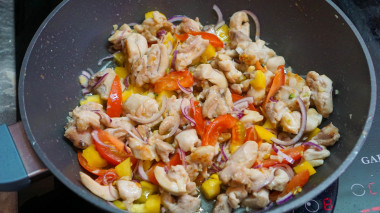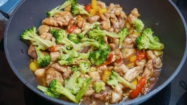 В сковороде разогрейте подсолнечное масло. Выложите курицу и обжарьте, помешивая, до полуготовности. Добавьте чеснок и обжарьте 1 минуту. О том как выбрать сковороду и идеальное для жарки масло читайте в отдельных статьях, ссылки под шагами. Но учтите, что в паназиатской кухне не используется оливковое масло.