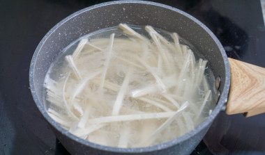 Лапшу отварите в кипящей воде до готовности в соответствии с инструкцией на упаковке. О том, как выбрать идеальную кастрюлю читайте в статье, ссылка под шагами.