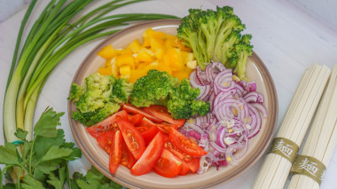 Выложите лапшу в сковороду к овощам и перемешайте.