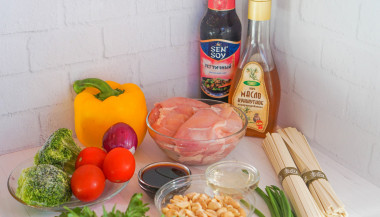 Как сделать лапшу с курицей и овощами в соусе? Для начала подготовьте необходимые ингредиенты по списку. Вместо филе с бедра можете использовать филе с грудки, но оно может получится не таким сочным.
