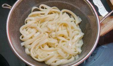 Откиньте лапшу на дуршлаг. Я использовала лапшу удон. Но можно готовить из любой другой паназиатской лапши: яичной, фунчозы, собы и т. д.