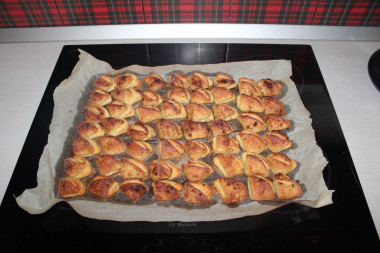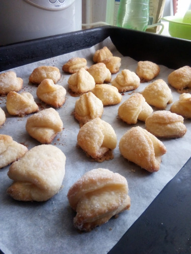 На 0,5кг творога добавила пачку масла 180г 72,5%,300г муки и ещё 4 столовые ложки ушло при раскатке теста, +1/2ч.л. разрыхлителя и щепотку ванилина)
