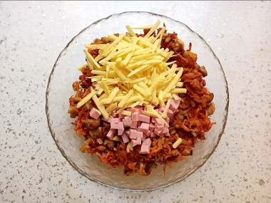 Для начинки обжарила лук с морковью до золотистого цвета , добавила ножки грибов и жарила до готовности. Зажарку посолила и поперчила. Смешала с сыром и колбасой.