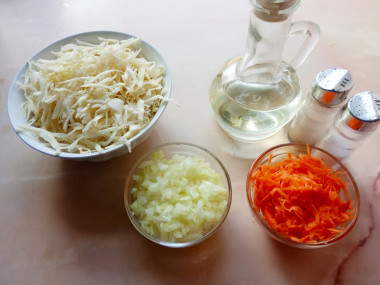 4. Нашинкуйте капусту, перетрите ее с солью. Почистите и мелко нарежьте лук, морковь натрите на крупной терке.