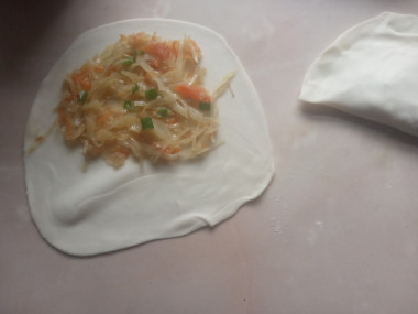 11. В центр каждого пласта выложите начинку, затем сложите пополам и края плотно защипните, придавая пирожку классическую форму чебурека.