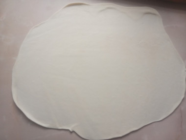 10. Каждый шарик раскатайте в небольшой тонкий пласт пару мм толщиной.