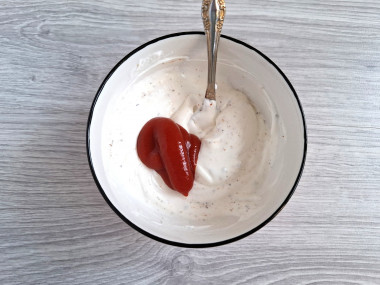 Лук нарезала полукольцами, а морковь натерла на тёрке с крупными зубцами. Сметану смешала со специями для рыбы, паприкой и сушеной петрушкой, посолила. Добавила немного кетчупа, мне нравится томатная нотка в сочетании с рыбой.