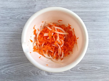 Лук нарежьте кольцами или полукольцами (как Вам больше нравится), морковку натрите на крупной тёрке, в сметану добавьте соль и немного душистого перца по желанию.