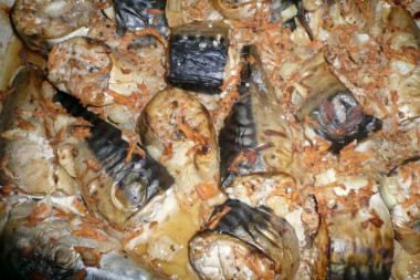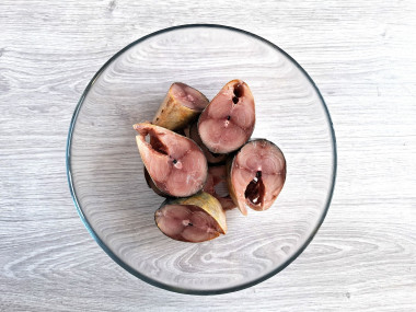 Отрежьте у скумбрии головы и хвостики. Не спешите их выбрасывать, из них можно сварить в дальнейшем прекрасный рыбный бульон для ухи или супа. Удалите внутренности и сполосните рыбу под проточной водой. Тушки скумбрии нарежьте на кусочки толщиной примерно два- три сантиметра. Лук и морковь почистите и помойте.