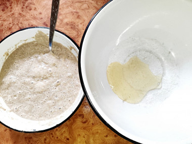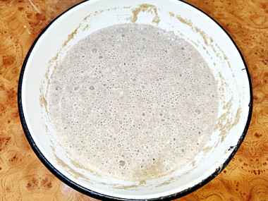 Накройте миску и оставьте на 6-8 часов в теплом спокойном месте. За это время опара вырастет в объеме и сильно забродит.