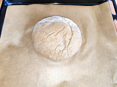 Сформируйте из него колобок и положите на противень, застеленный бумагой для выпечки. Накройте колобок полотенцем и оставьте на 40 минут. Духовку включите разогреваться на 220°С. С выбором пергамента поможет статья по ссылке в конце рецепта.