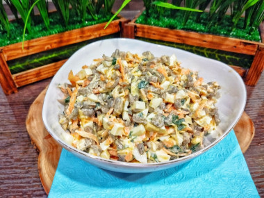 Также в качестве заправки можно использовать не только майонез, но и сметану или натуральный йогурт. Их можно взять по отдельности либо смешать с майонезом в любой пропорции на свой вкус - это снизит калорийность блюда.