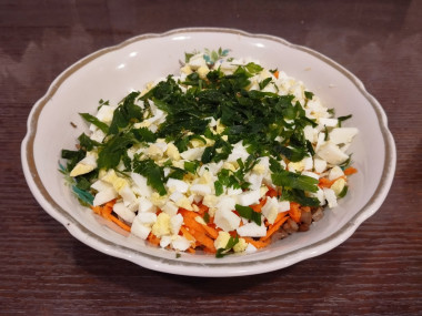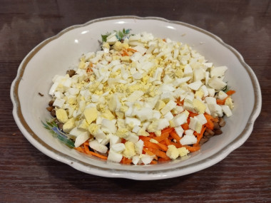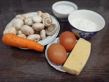 Как сделать салат с шампиньонами и яйцами? Подготовьте все необходимые ингредиенты для приготовления. Укроп помойте и отряхните от влаги. Морковь почистите и тщательно вымойте. У шампиньонов отрежьте места загрязнения, вымойте в холодной водой. Разложите грибы на чистом полотенце на 15-20 минут, чтобы обсохли. Яйца отварите на среднем огне в течение примерно 12 минут после закипания, остудите.