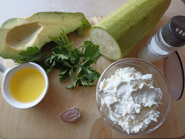 Как приготовить намазку из кабачков? Подготовьте все продукты по списку. Авокадо выбирайте спелое и мягкое. Очень важно выбрать спелый авокадо. Созревший плод можно определить надавив на область возле плодоножки. Если там останется вмятина, авокадо, скорее всего, перезрело. А если мякоть слегка прогибается, но сохраняет свою форму, значит, авокадо достаточно созрело. Духовку поставьте разогреваться на 180 градусов.