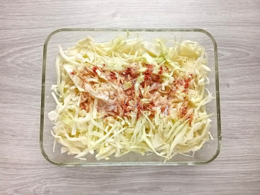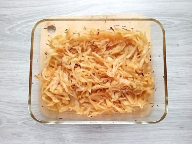 Возьмите подходящую форму для запекания. Выложите в нее нарезанную капусту. Она довольно объемная, чтобы у вас влезло побольше, помните ее руками. Влейте растительное масло, посолите и поперчите по вкусу, можете добавить любимые специи. Аккуратно перемешайте капусту прямо в форме. О том как выбрать идеальную форму для запекания читайте в статье, ссылка под шагами.