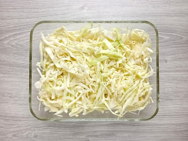 Сразу включите разогреваться духовку на 180°С. Кочан обмойте, оборвите испорченные, вялые и грязные листья. Отрежьте от кочана большой кусок. Нарежьте его любым способом — я нарезала крупной соломкой, можете резать тоньше или на квадратики.