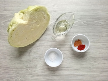 Я нарезала капусту соломкой, немного помяла и уложила в стеклянную форму, смазанную растительным маслом. Сверху посыпала солью, паприкой и карри, перемешала. Форму закрыла фольгой и запекала сначала 20 минут при 180°С, затем добавила примерно 50 мл. воды и запекала ещё 20 минут. Без фольги не стала запекать, капуста и так приобрела красивый карамельный цвет.
