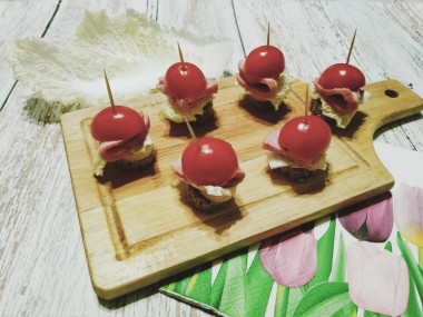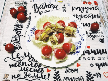 Для праздничного торжества сделала канапе с сыром и ветчиной на шпажках. Это удобная и аппетитная закуска, на один зубок. Ветчина и сыр отлично гармонируют друг с другом, а помидор черри придает нотку кислинки. Серый хлеб и хрустящий салатик в сочетании с остальными ингредиентами - это очень вкусно. В роли шпажек у меня выступили зубачистки. Маленьких детей на празднике не было, поэтому я не боялась, что кто-то уколится. В качестве формочки для вырезания я взяла маленькую крышку от баночки диаметром 2,5 см. Ветчину я порезала полукольцами. Тонко, конечно, у меня не вышло. Канапе получились не такими красивыми, как у Юлии, но зато всем понравились и быстро съелись. Делаются они легко, а получаются оригинальными и вкусными - то, что нужно для праздника! Большое спасибо за рецепт!