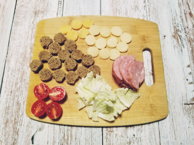 Как сделать канапе с сыром и ветчиной на шпажках? Подготовьте необходимые продукты. Ветчину выбирайте хорошего качества. От этого будет зависеть вкус закуски. Листья салата предварительно помойте и обсушите. Можно использовать любую зелень: листья петрушки или укропа.