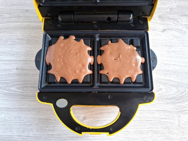 Сливочное масло я растопила в кастрюльке на слабом огне. Перелила его в миску и добавила остальные ингредиенты. Разрыхлитель, какао и муку просеяла и заместла тесто венчиком. Оно получилось достаточно густым, но текучим. Я выкладывала по столовой ложке с горкой на каждую панель, чтобы вафель получилось побольше). В моем мультипекаре выходило примерно по 2,5 минуты на порцию. Но у всех разная техника и степень нагрева, поэтому и время будет разным.