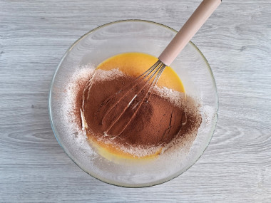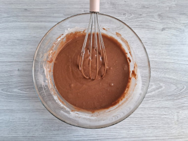 Всыпьте просеянную с какао и разрыхлителем муку и перемешайте до однородности. Должно получиться тягучее текучее тесто. Муку просеивайте обязательно. В ней могут быть не перемолотые или плохо перемолотые частицы, а также во время просеивания мука насыщается кислородом.