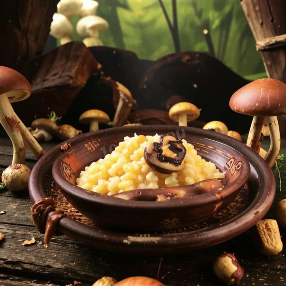 Постоянно помешивая, добавь грибы, обжаренный чеснок и специи и продолжай готовить ризотто подливая частями бульон (это займёт около 20-25 минут). В конце добавь тертый пармезан и еще немного сливочного масла при желании. Перемешай ризотто и дай ему пару минут настояться под крышкой.