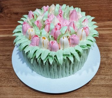 Разрежьте бисквиты на 4 коржа. У меня в процессе один сломался, я готовила торт из трех.