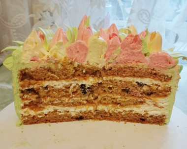 Для семейного торжества решила приготовить торт морковно сметанный. Выпечку с морковью пробовала и раньше,знаю,что это очень вкусно. Приготовление совсем не сложное и понятное,следуя рецепту. Я только в тесто не добавляла орехи,а добавила изюм.