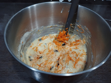 Всыпьте порциями сухие ингредиенты и морковь с орехами ко взбитым яйцам. Аккуратно перемешайте тесто силиконовой лопаткой. Тесто получится средней густоты, как на оладьи.