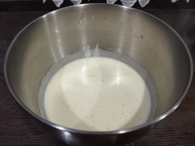 Приготовьте бисквит. Яйца вбейте в миску и начните взбивать, постепенно увеличивая скорость миксера и порциями всыпая к ним сахар. Взбивайте яйца долго, 15-20 минут, до пышной и светлой массы. Затем влейте к ним масло и вмешайте его миксером на самой маленькой скорости.