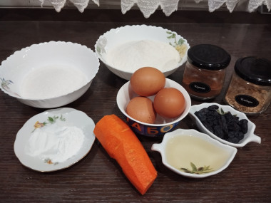 Морковь натрите на мелкой терке, затем слегка отожмите ее руками, сок слейте. Вес моркови считается уже вот в таком отжатом виде. Добавьте к моркови рубленые орехи. Также хорошо подойдет изюм и другие сухофрукты.
