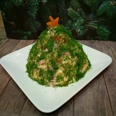 Можете нарисовать майонезом гирлянду при помощи кулинарного мешка. Подавайте салат к столу. Приятного аппетита!