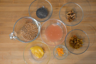Как правильно варить кутью из пшеницы с медом, маком и орехами на Рождество? Подготовьте продукты. Пшеницу возьмите в виде цельных зерен. Изюм — без косточек, любого цвета. Орехи грецкие, но вообще подойдут любые. Вместо сока ананаса можно взять сок апельсина или обычную воду. Я взяла разбавленный сироп из консервированных ананасов.